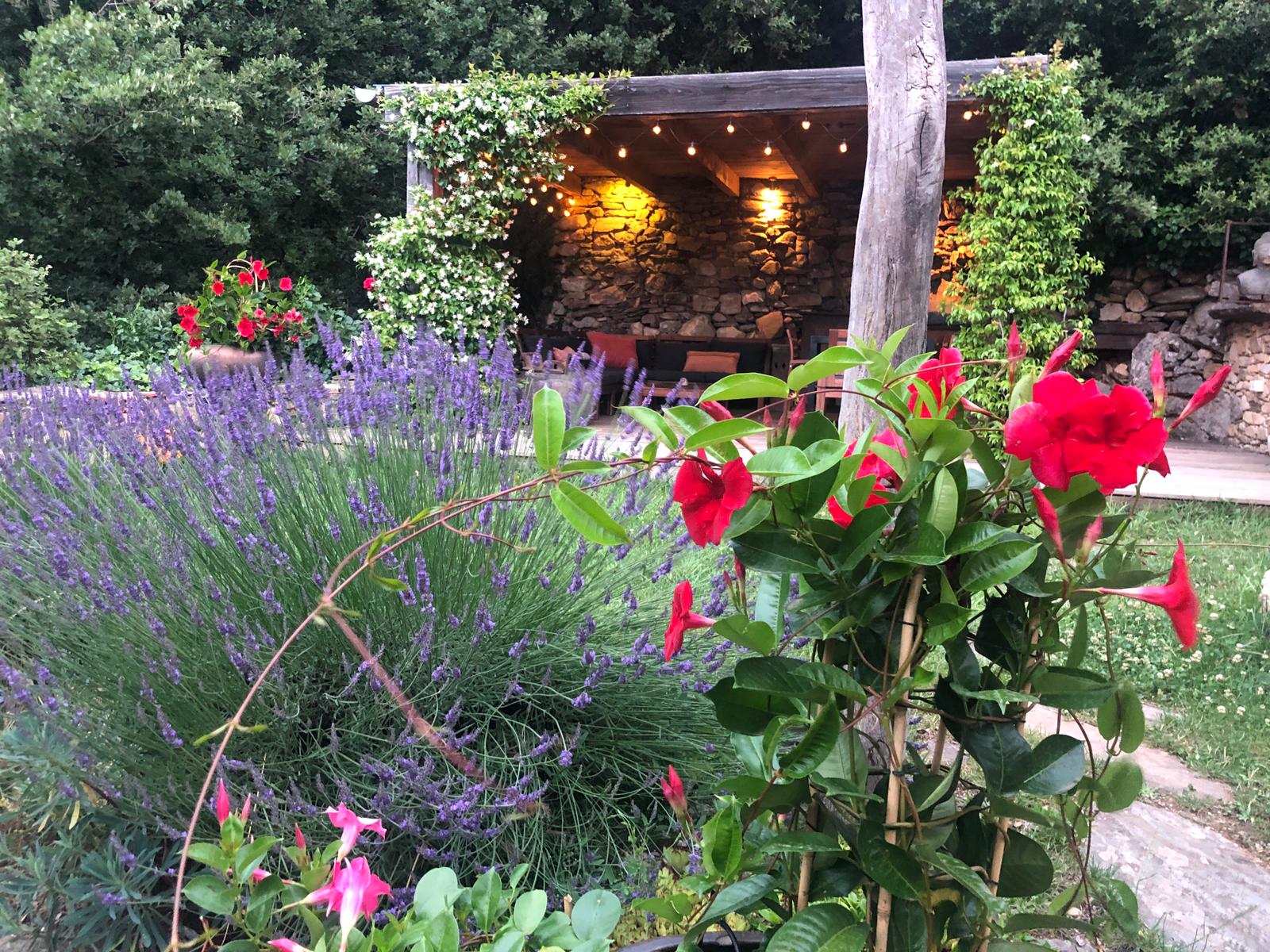 In this marvelous garden, plants and minerals mingle, olive trees, roses, lavender, banana trees, cacti, flowers, green grass... stone walls and low walls, traditional slate terraces or in wood, a large pergola that protects from the sun or the rain, very comfortable with its teak lounge and dining room, its plancha, ideal space to enjoy the garden at any time of the day.
